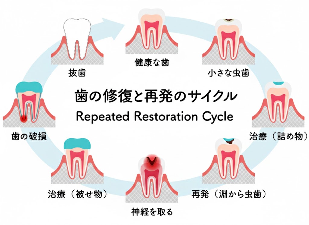 初期のむし歯は経過観察で済むこともありますが、進行して歯に穴が開くと、削るなどの治療が必要になります。治療期間や費用がかかるだけでなく、一度削った歯は再発リスクが高まります。