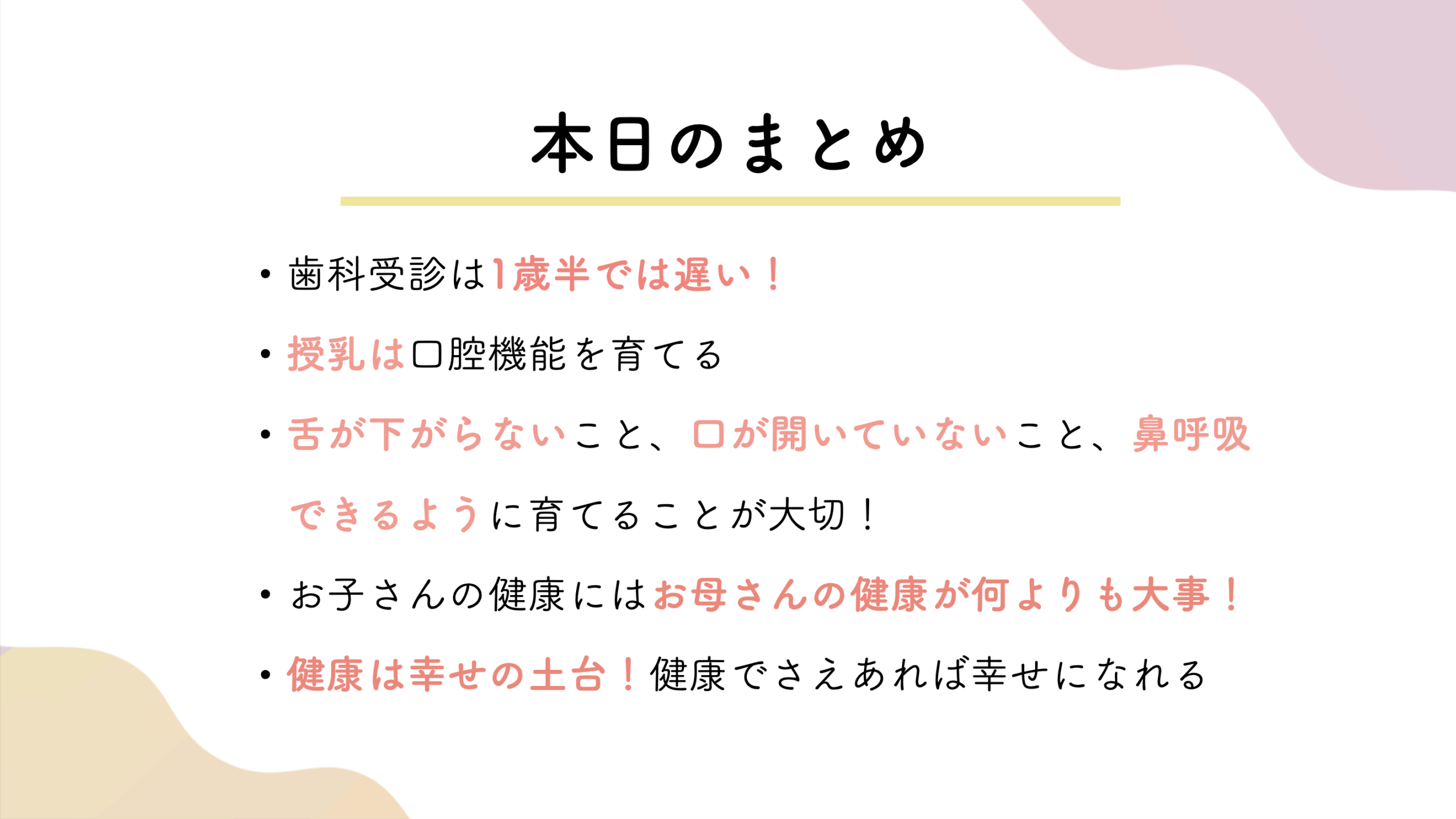 「歯の検診」だけではなく、 食事・姿勢・呼吸・睡眠まで含めてトータルに学び、整えていくこと が、母子の健やかな成長につながります。