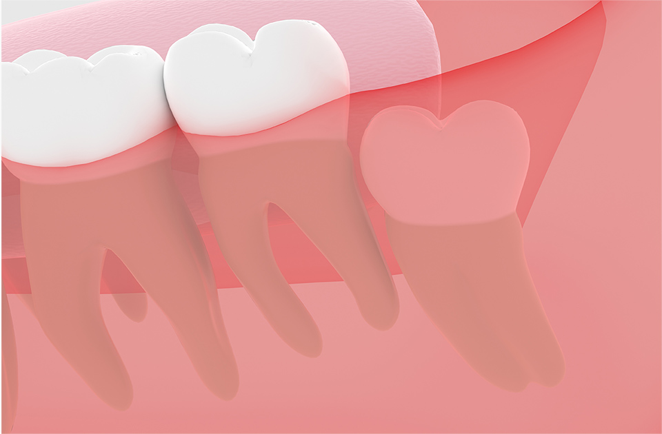 まっすぐに生えない親知らずは歯磨きが難しく、歯周病(智歯周囲炎)やむし歯の原因となります。歯周病の症状は放置すると自然におさまることもありますが、細菌は残るため、痛みが再発したり、時には強い痛みになったりする可能性があります。