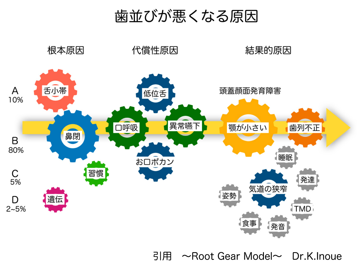 左の図はルートギアモデルと呼ばれる、お子様の歯並びが悪くなる原因を歯車に見立てて、それぞれがどう関係しあって歯並びが悪くなっているかを図に表したものです。